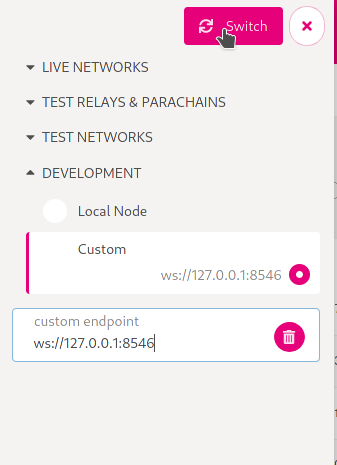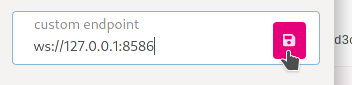 Now you should see a text area with the label "custom endpoint", here you add your local node's websocket address, usually "ws://127.0.0.1:8586", click the Save icon on the right of the text box to save the endpoint.